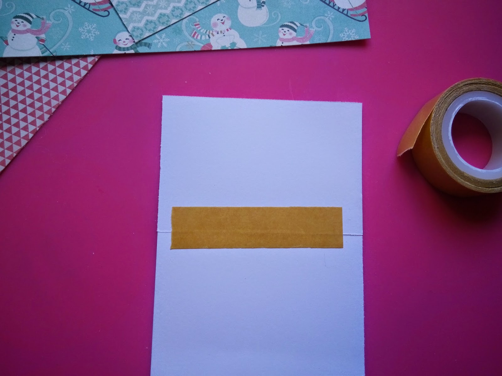 Primero unimos las dos piezas de papel decorado por el reverso con una cinta de doble cara.
